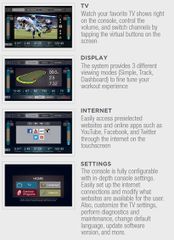 | TV | Watch your favorite TV shows right on the console, control the volume, and switch channels by tapping the virtual buttons on the screen The system provides 3 different viewing modes (Simple, Track, Dashboard) to fine tune your workout experience. |